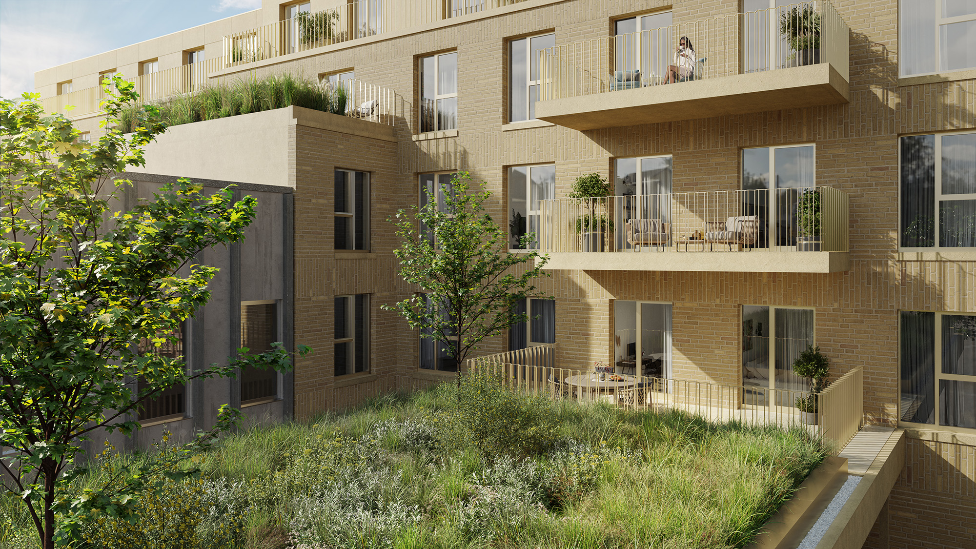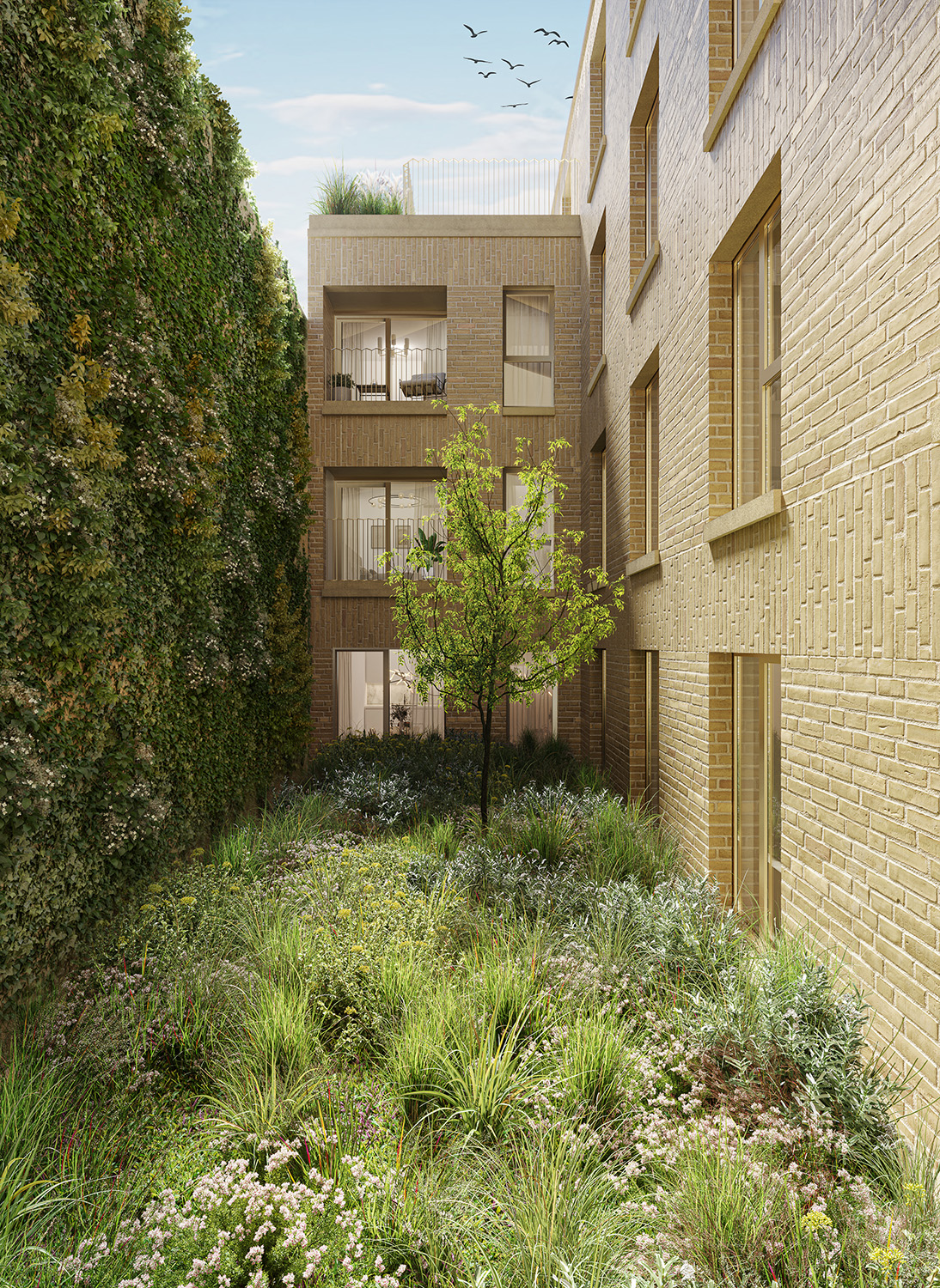 ondergaat en wordt gekoppeld met de nieuwbouwontwikkeling links. Beide panden herbergen inpandige, funky stadsterrassen